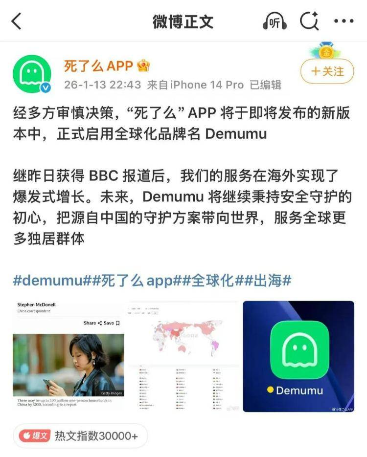 至于为何改名为“Demumu”,创始人员解释,前两个字母取自英文单词“Death”,以承接“死了么”此前的热度;后半部分则有意营造萌感,弱化原名的沉重。