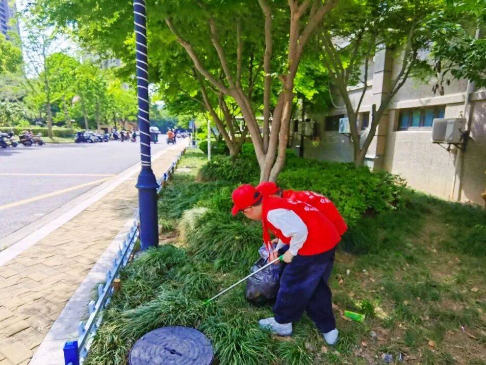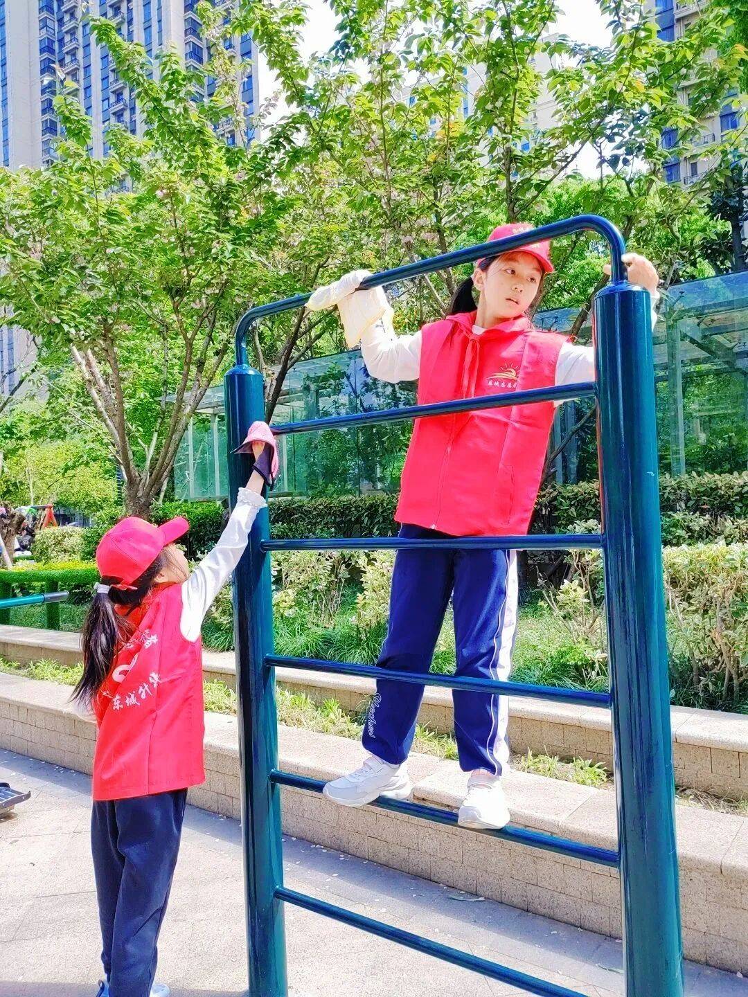 擦拭健身器材的队员们踮起脚尖、俯下身姿,拿着抹布仔细擦拭每一处扶手、每一个器械表面,不放过一丝灰尘、一处死角。负责捡拾垃圾的队员们也毫不松懈,大家手持垃圾夹,穿梭在绿化带旁、马路边,眼神专注地搜寻着草丛里的纸屑、塑料袋、烟头,以及路边散落的杂物。
