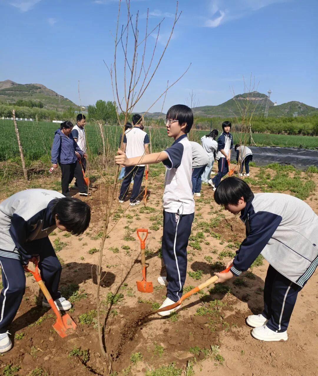 环保清洁后,队员们拿起铁锹,两两配合、分工协作:挖坑、扶苗、填土、夯实,每一个步骤都严谨有序。在辅导员的指导下,大家小心翼翼地将一株株树苗植入土壤。每一棵树苗都承载着对地球的美好祝愿,每一次挥锹都凝聚着守护绿色的坚定决心。看着挺拔的树苗扎根大地,队员们脸上满是自豪,在劳动中体会“植树造林,功在千秋”的深刻意义,为大地增添了蓬勃生机。