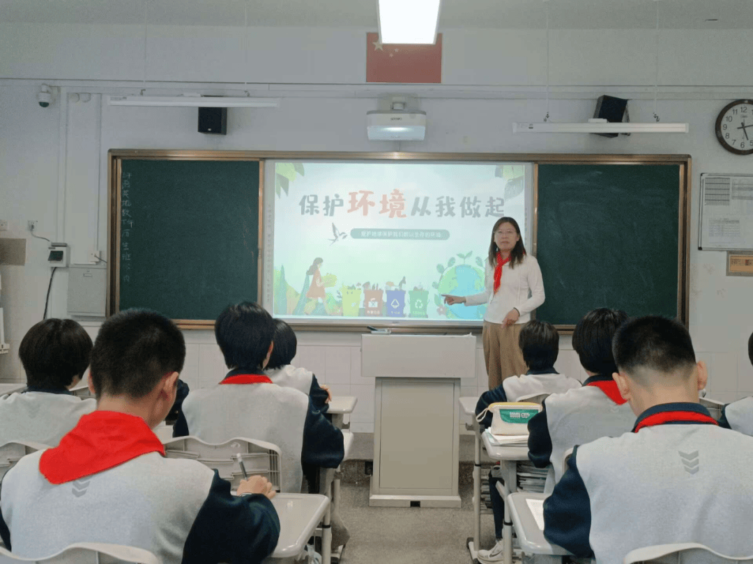 中队辅导员李老师通过生动的生态影像、鲜活的环境案例,解读地球生态面临的挑战,结合“绿水青山就是金山银山”的理念,引导队员们思考个人与自然的联结,鼓励大家从捡拾垃圾、节约资源等小事做起,争做环保践行者。