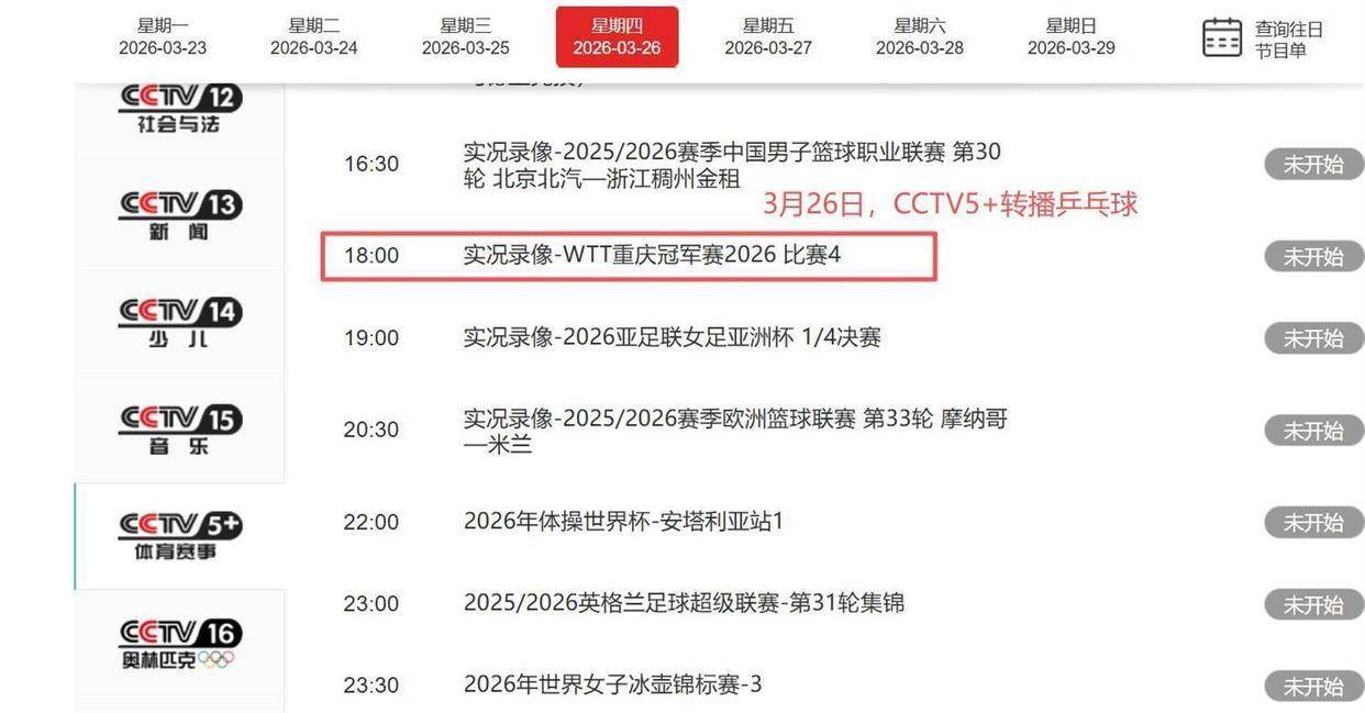 在世界杯开赛前的空档期,央视体育频道为球迷们安排了往期赛事的回放。 例如,在3月25日晚间,CCTV5+频道播出了WTT重庆冠军赛的比赛录像。 这场在一个月前于主场进行的比赛,结果让国乒球迷颇为遗憾,国乒最终仅收获男女单打两枚银牌,冠军分别被日本选手张本美和与法国选手费利克斯·勒布伦夺得。