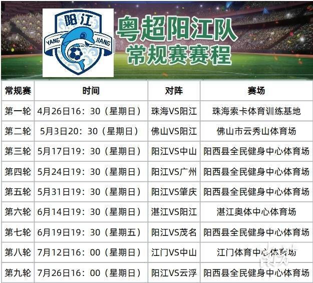 4月14日,2026年广东省城市足球超级联赛(粤超)常规赛竞赛日程正式公布。阳江队首战将在珠海索卡体育训练基地与珠海队展开对决,比赛时间为4月26日16:30。