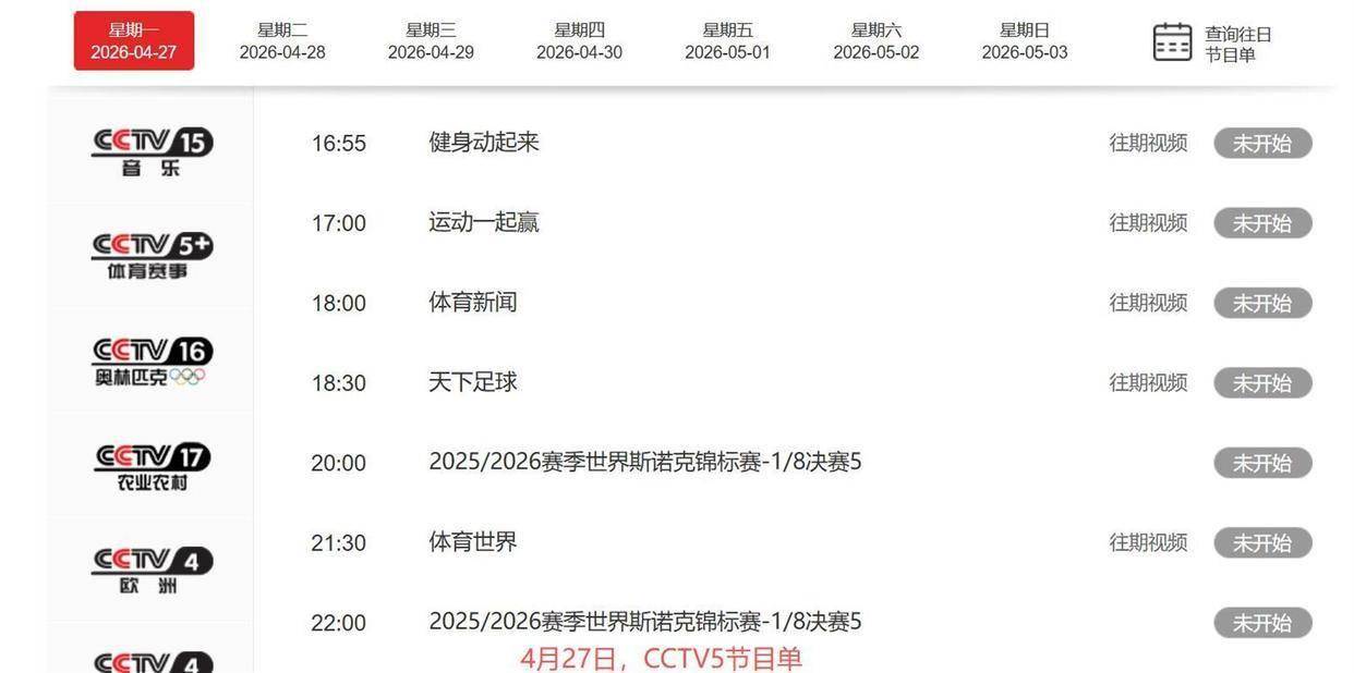 根据央视的节目预告,4月27日晚上23点05分,CCTV5体育频道将播出“实况录像-2026年国际乒联单打世界杯1”。 这场比赛回顾的正是王楚钦和孙颖莎在澳门世界杯上的夺冠之旅。 而在今天中午12点28分,CCTV5+体育赛事频道已经重播了单打世界杯的女单比赛录像。 此外,CCTV16奥林匹克频道也会在晚上18点55分,播放单打世界杯的实况录像。