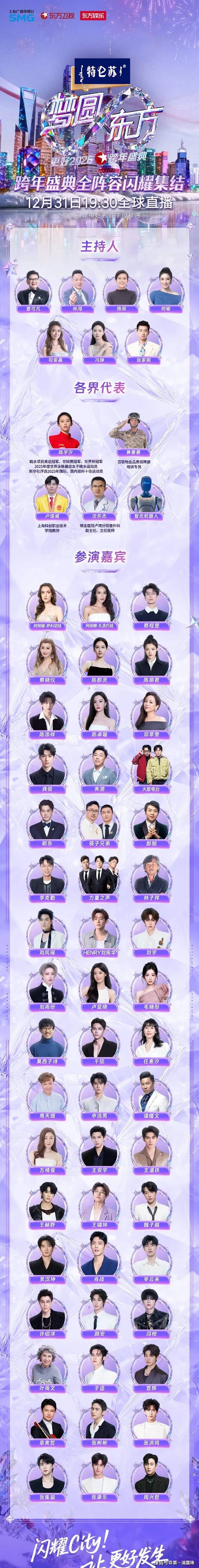 他们的跨年盛典19:30在上海梅赛德斯-奔驰文化中心直播,支持4K超高清和多视角切换,东方卫视、腾讯视频、看东方APP都能看。
